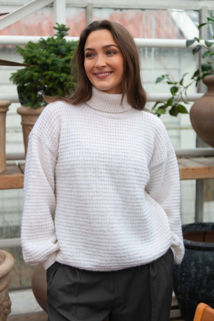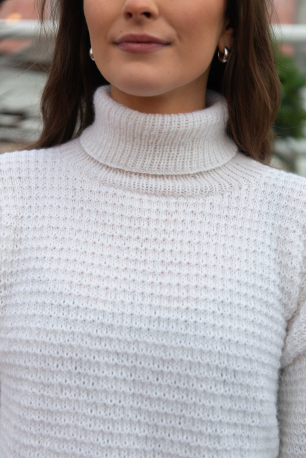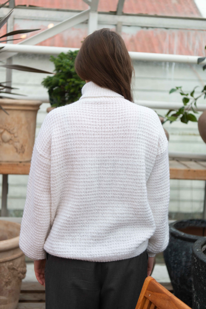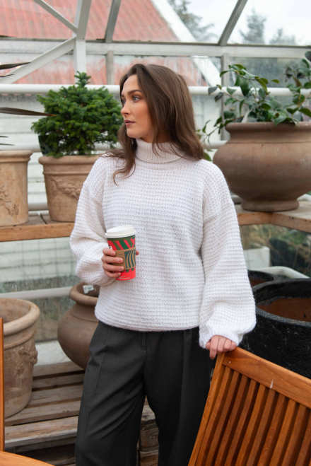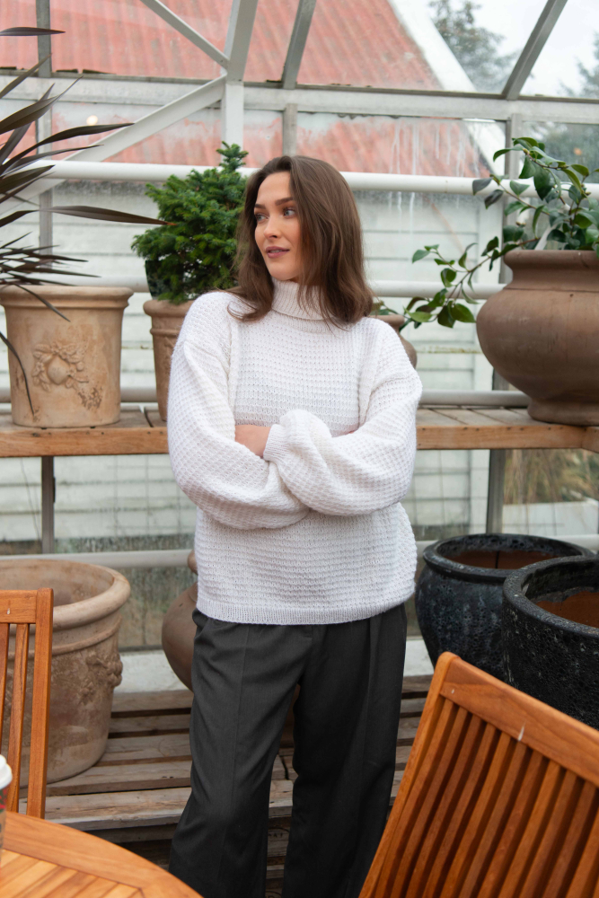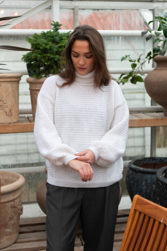 So finden Sie die passende Größe: Messen Sie ein Kleidungsstück aus, das Ihnen gut passt, und vergleichen Sie die Maße mit der Anleitung. Entscheiden Sie sich basierend auf der Brustweite des Rumpfteils für eine Größe. Die Länge des Rumpfteils sowie der Ärmel kann nach Belieben angepasst werden, aber denken Sie daran, zusätzliches Garn zu bestellen, wenn Sie die Länge verändern möchten!