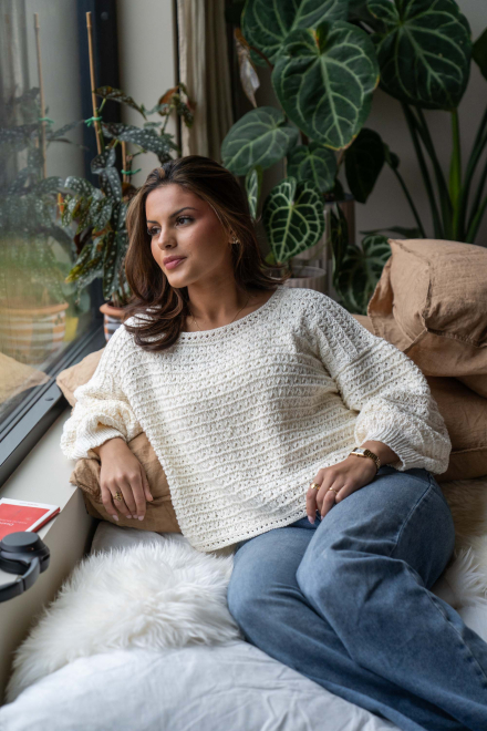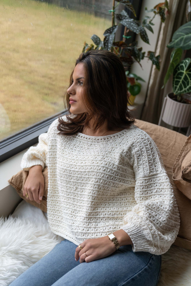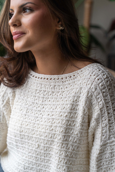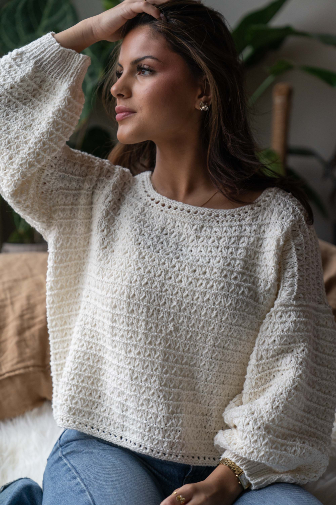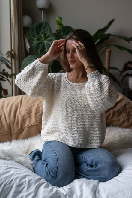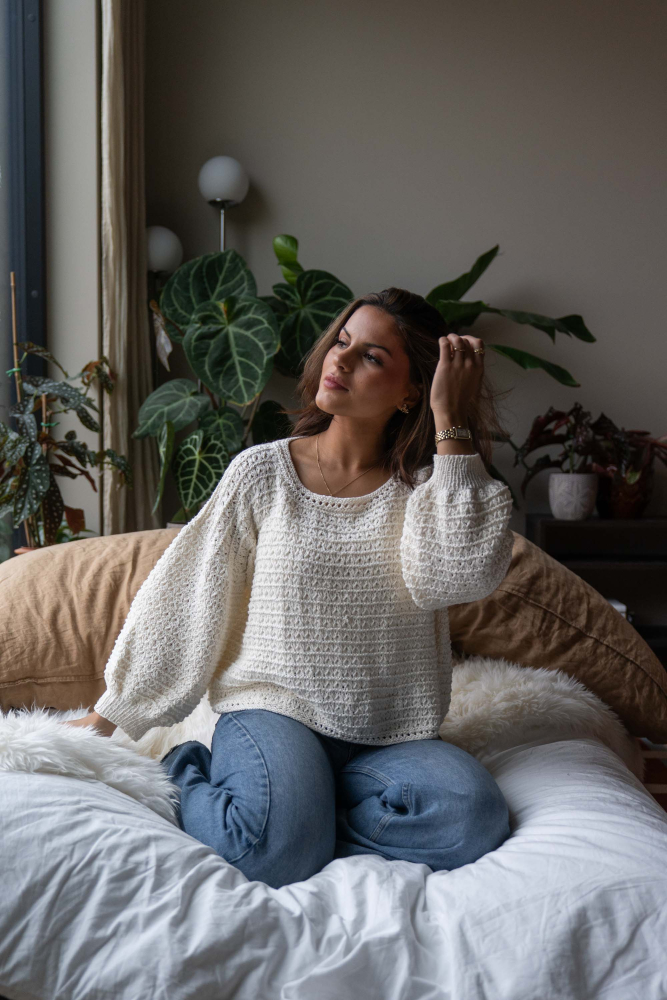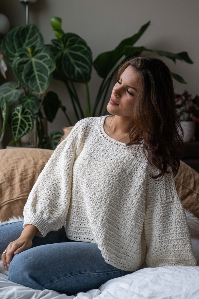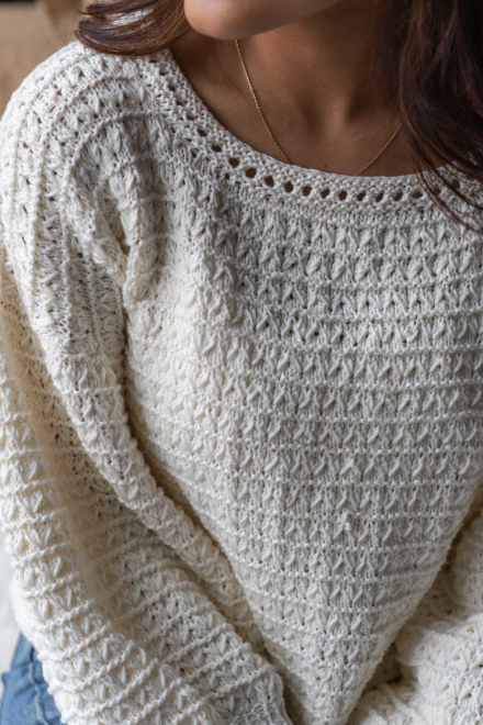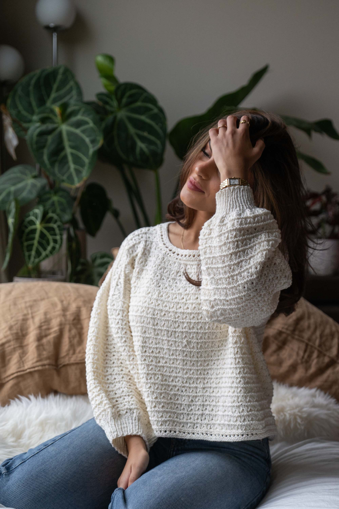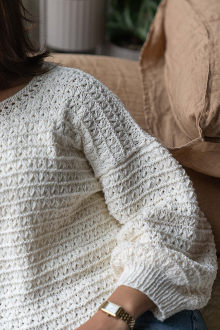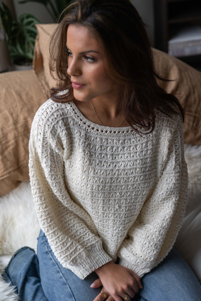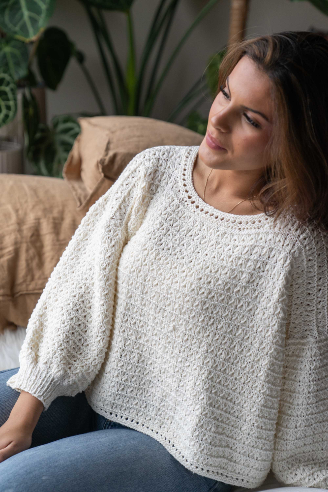 So finden Sie die passende Größe: Messen Sie ein Kleidungsstück aus, das Ihnen gut passt, und vergleichen Sie die Maße mit der Anleitung. Entscheiden Sie sich basierend auf der Brustweite des Rumpfteils für eine Größe. Die Länge des Rumpfteils sowie der Ärmel kann nach Belieben angepasst werden, aber denken Sie daran, zusätzliches Garn zu bestellen, wenn Sie die Länge verändern möchten!