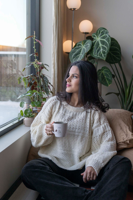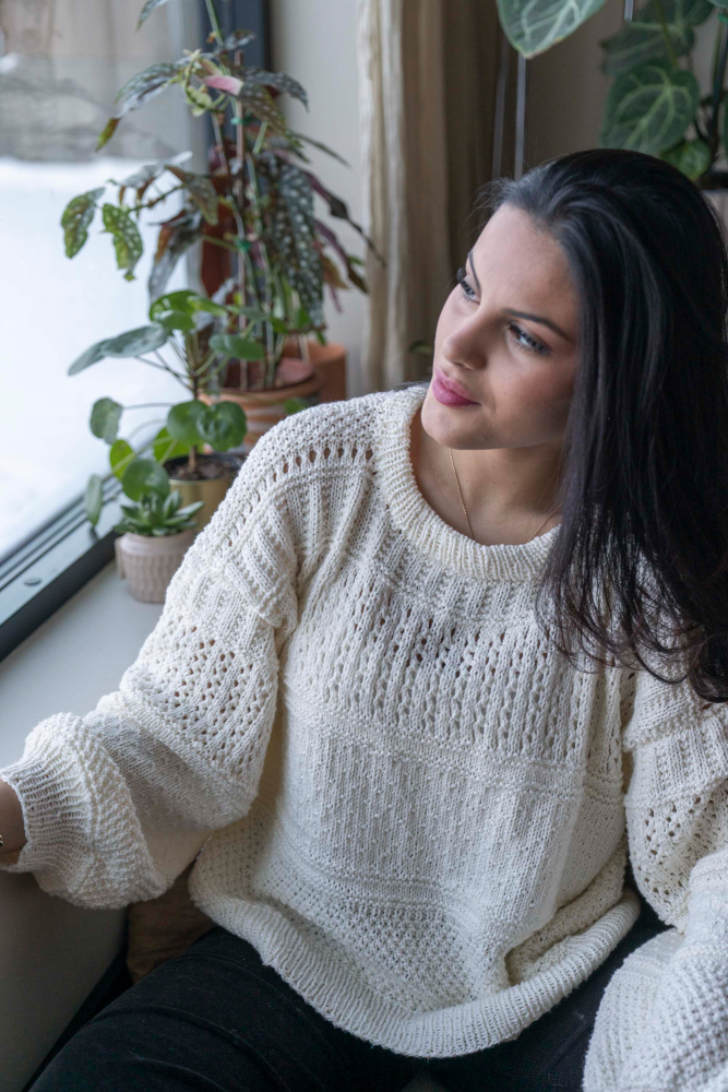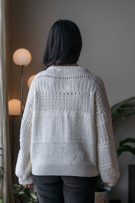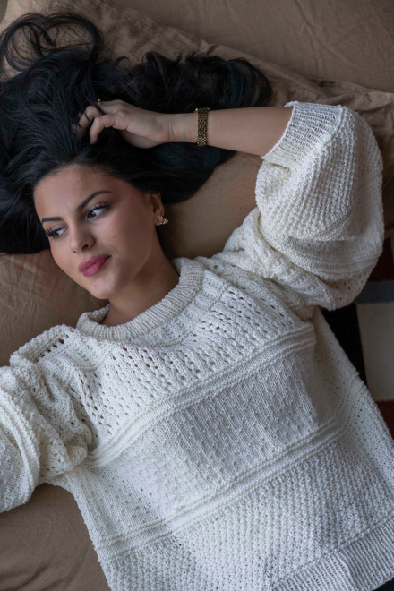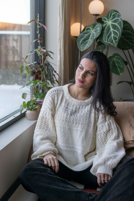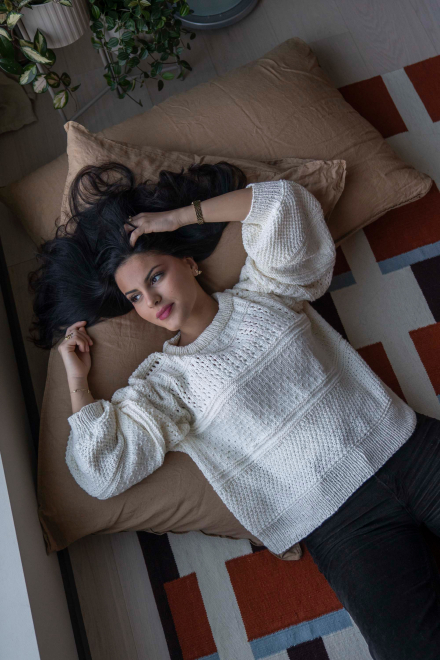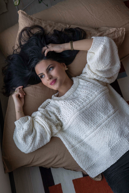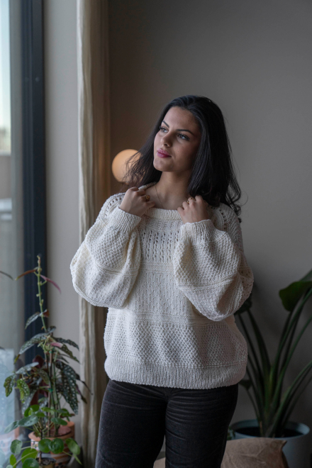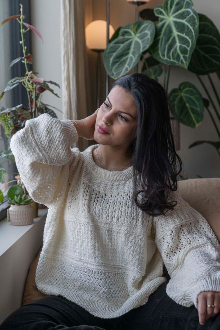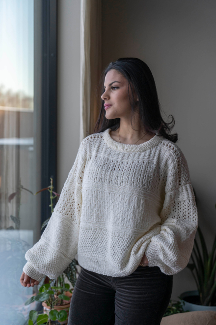 So finden Sie die passende Größe: Messen Sie ein Kleidungsstück aus, das Ihnen gut passt, und vergleichen Sie die Maße mit der Anleitung. Entscheiden Sie sich basierend auf der Brustweite des Rumpfteils für eine Größe. Die Länge des Rumpfteils sowie der Ärmel kann nach Belieben angepasst werden, aber denken Sie daran, zusätzliches Garn zu bestellen, wenn Sie die Länge verändern möchten!