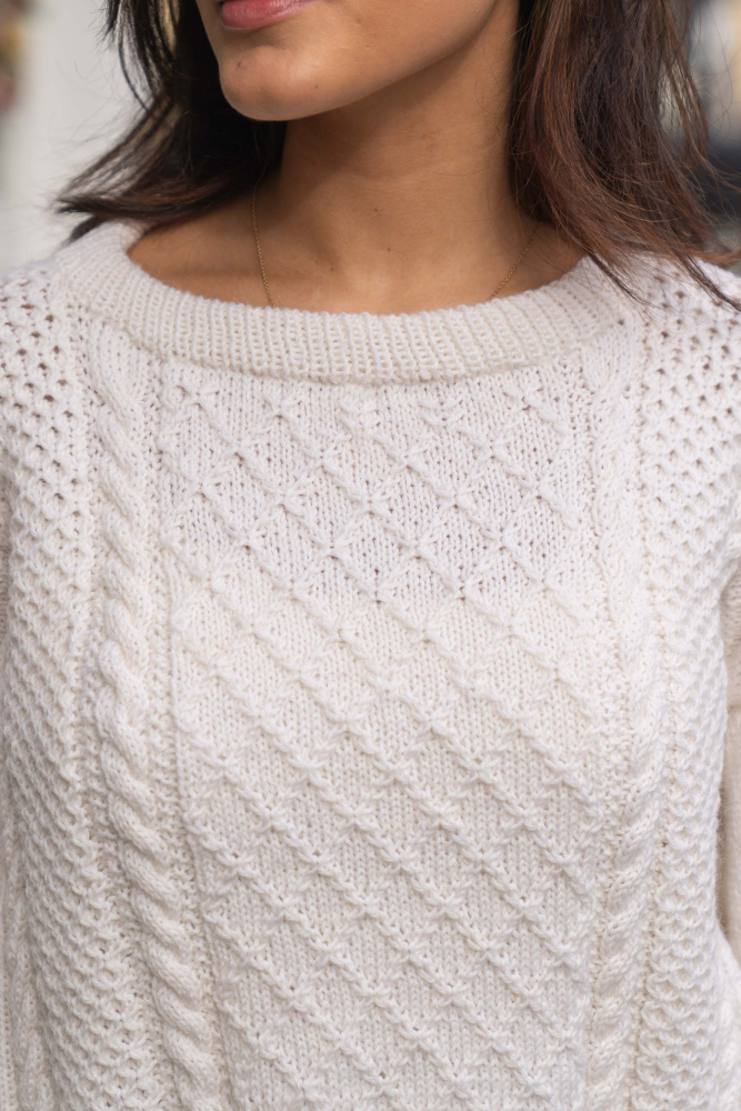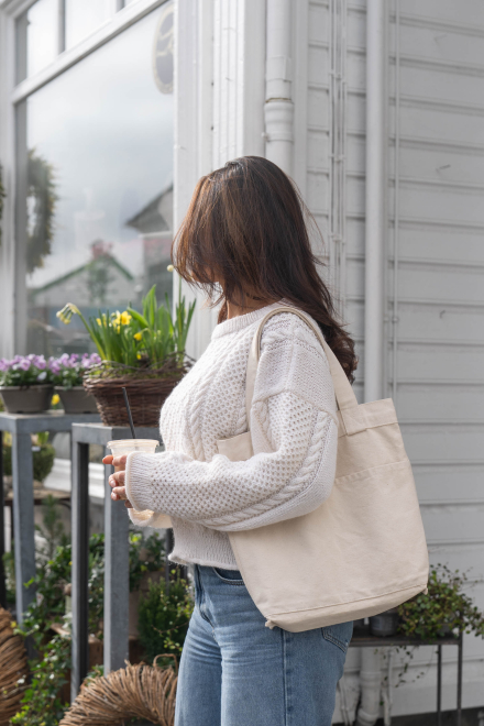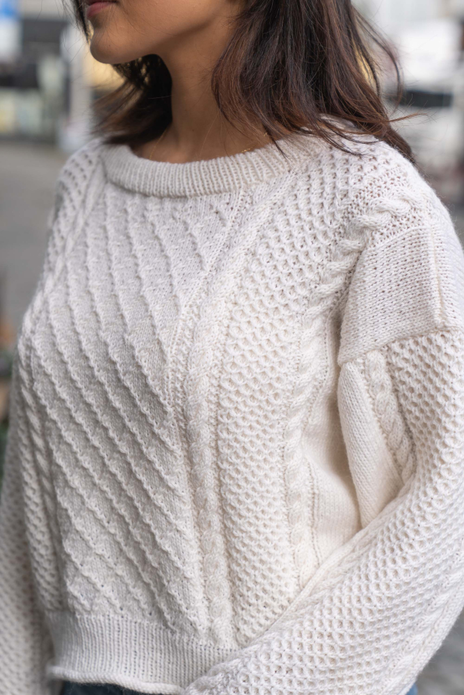 So finden Sie die passende Größe: Messen Sie ein Kleidungsstück aus, das Ihnen gut passt, und vergleichen Sie die Maße mit der Anleitung. Entscheiden Sie sich basierend auf der Brustweite des Rumpfteils für eine Größe. Die Länge des Rumpfteils sowie der Ärmel kann nach Belieben angepasst werden, aber denken Sie daran, zusätzliches Garn zu bestellen, wenn Sie die Länge verändern möchten!