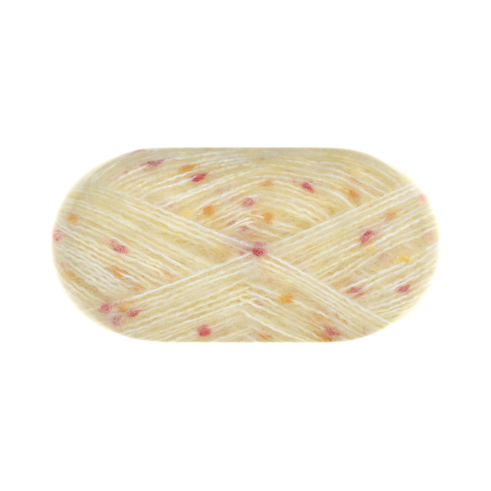 15 % Mohair, 25 % Wolle, 31 % Polyester, 9 % Nylon, 20 % Acryl, 50 g = ca. 135 Meter