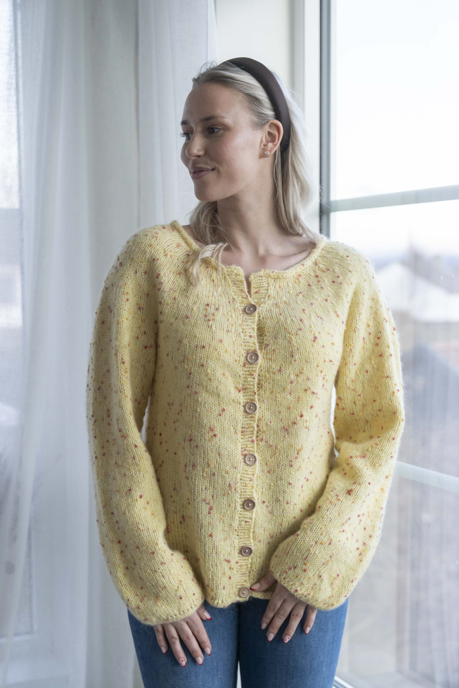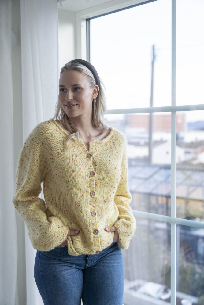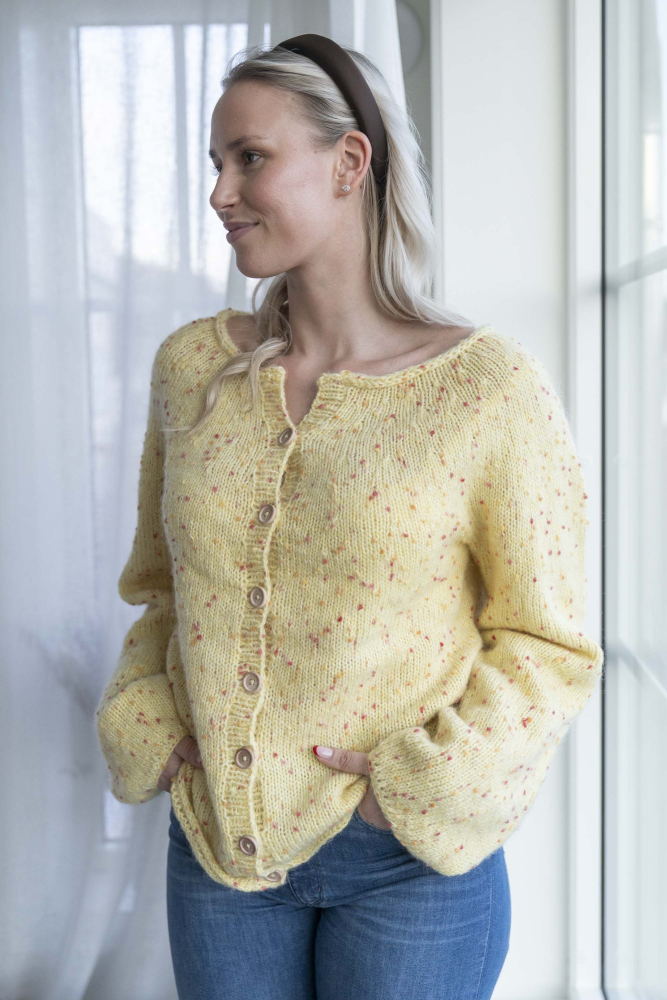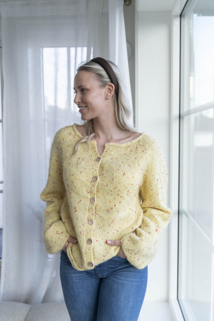 Jakke med rund sal. Strikkes nedenfra og opp.