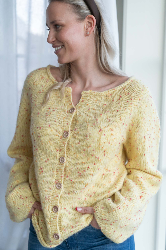 Jakke med rund sal. Strikkes nedenfra og opp.