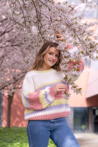 So finden Sie die passende Größe: Messen Sie ein Kleidungsstück aus, das Ihnen gut passt, und vergleichen Sie die Maße mit der Anleitung. Entscheiden Sie sich basierend auf der Brustweite des Rumpfteils für eine Größe. Die Länge des Rumpfteils sowie der Ärmel kann nach Belieben angepasst werden, aber denken Sie daran, zusätzliches Garn zu bestellen, wenn Sie die Länge verändern möchten!