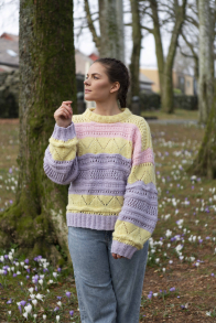 Glatt rechts, rechte Maschen, linke Maschen, Musterstrick. Das Kleidungsstück wird in Runden von unten nach oben gestrickt und hat Raglan. Schwierigkeitsgrad: Mittel.