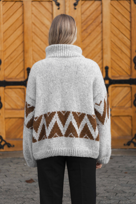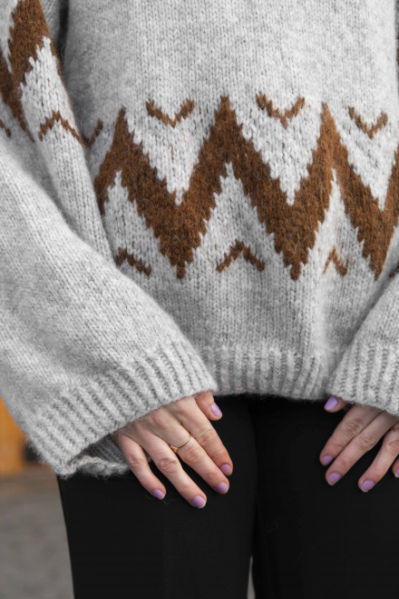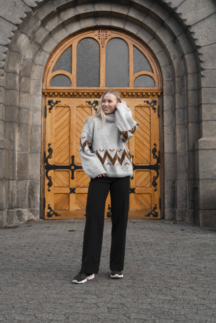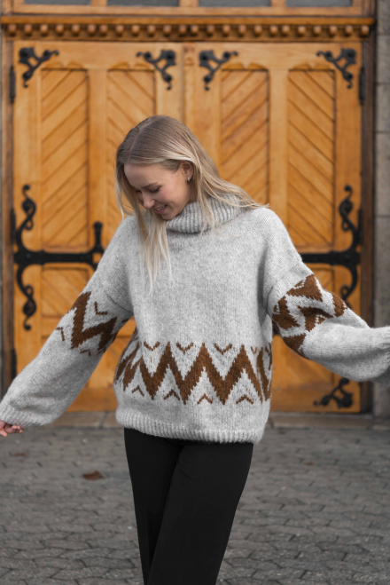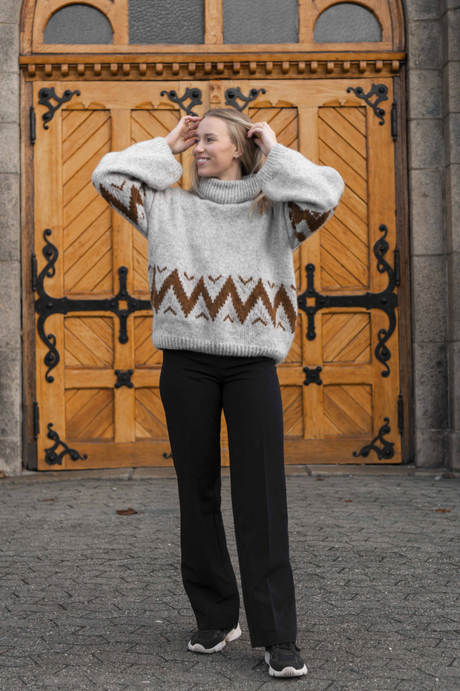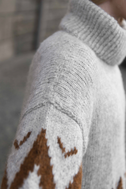 Glatstrik, snoet ret, snoet vrang, mønsterstrik. Trøjen strikkes først rundt, nedefra og op, derefter deles den op i for - og bagstykke med aflukningar til ærmegab, som strikkes separat. Ærmerne syes fast i hånden til sidst. Sværhedsgrad; Middel