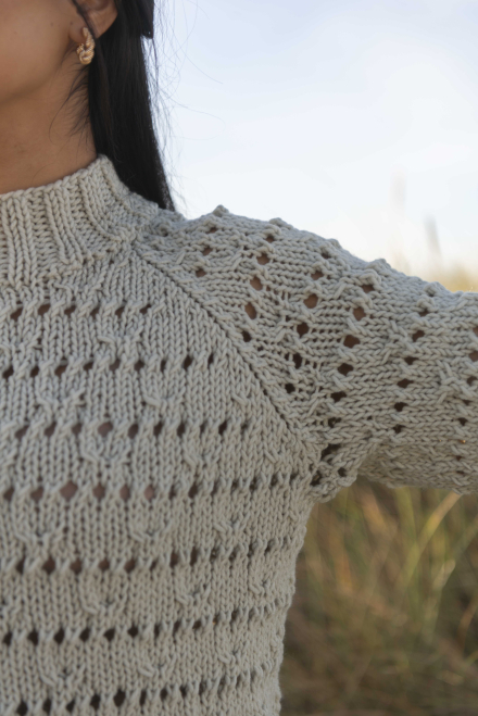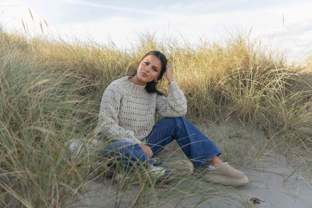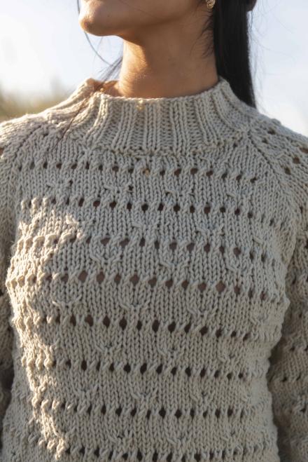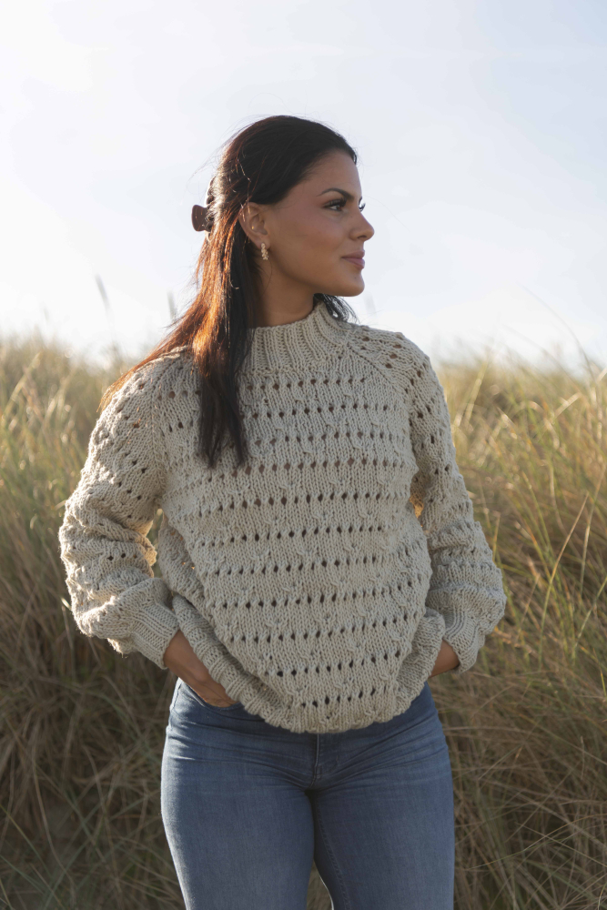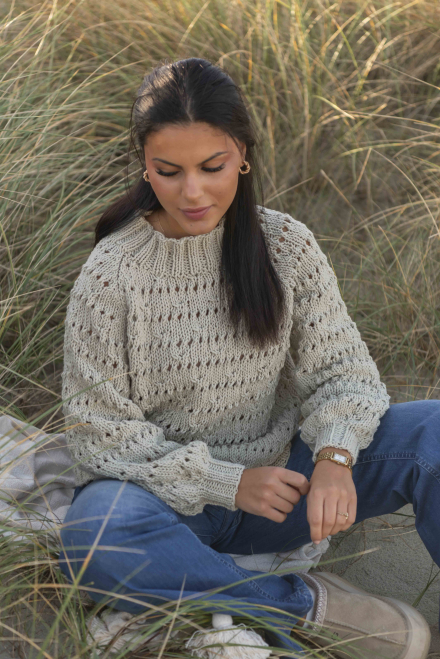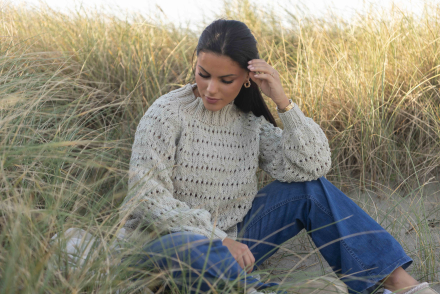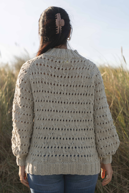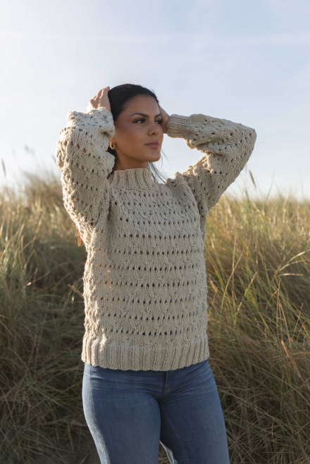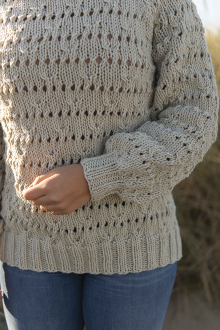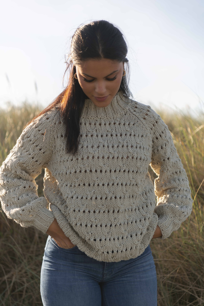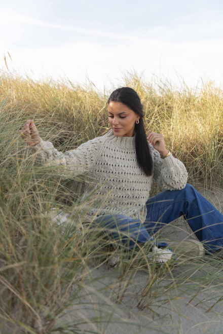 So finden Sie die passende Größe: Messen Sie ein Kleidungsstück aus, das Ihnen gut passt, und vergleichen Sie die Maße mit der Anleitung. Entscheiden Sie sich basierend auf der Brustweite des Rumpfteils für eine Größe. Die Länge des Rumpfteils sowie der Ärmel kann nach Belieben angepasst werden, aber denken Sie daran, zusätzliches Garn zu bestellen, wenn Sie die Länge verändern möchten!
