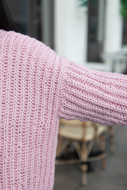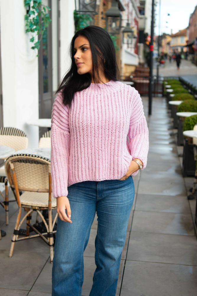 So finden Sie die passende Größe: Messen Sie ein Kleidungsstück aus, das Ihnen gut passt, und vergleichen Sie die Maße mit der Anleitung. Entscheiden Sie sich basierend auf der Brustweite des Rumpfteils für eine Größe. Die Länge des Rumpfteils sowie der Ärmel kann nach Belieben angepasst werden, aber denken Sie daran, zusätzliches Garn zu bestellen, wenn Sie die Länge verändern möchten!
