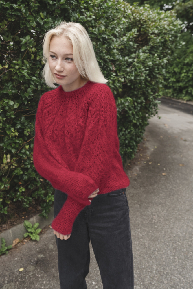 Du kan selv endre farge i strikkepakken ; velg da først størrelsen du ønsker å strikke, så kommer det opp fargevalg nedenfor. NB! Oppskrift vil alltid leveres i strikkepakkens originale farge: Dyp Rød