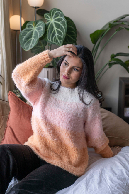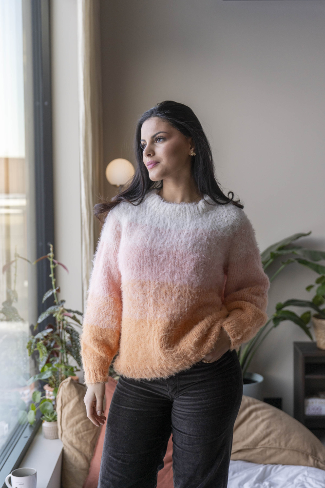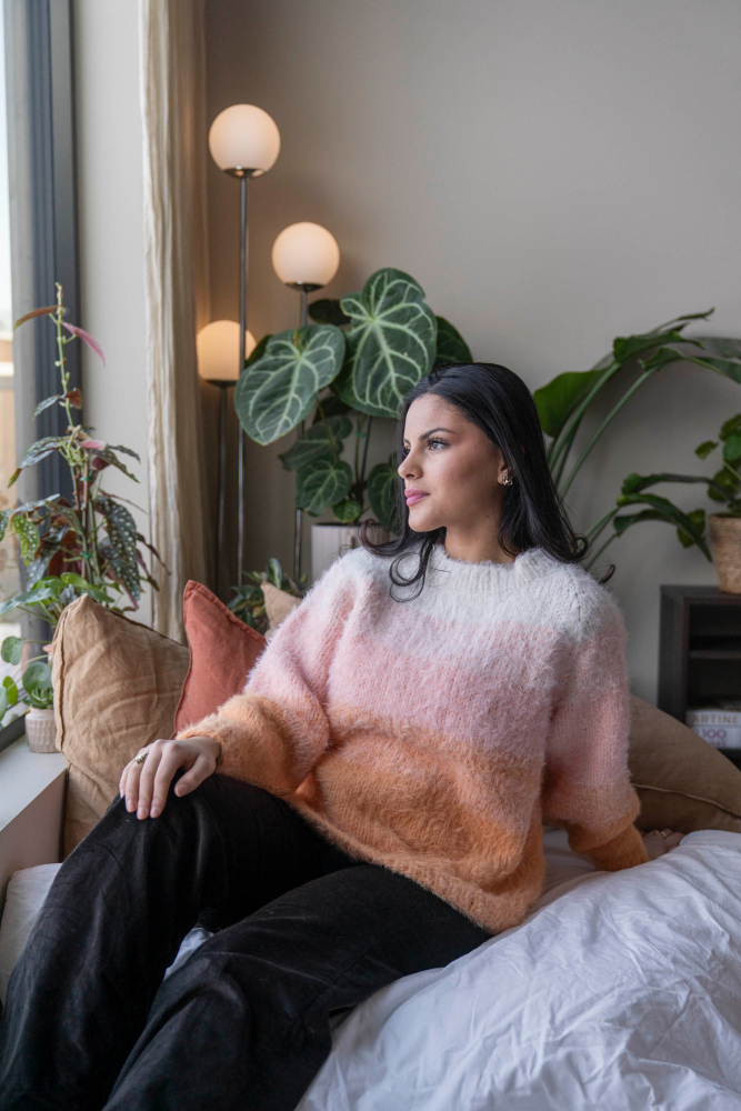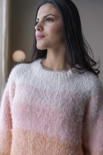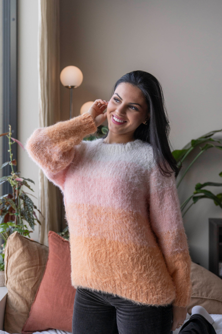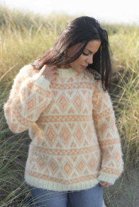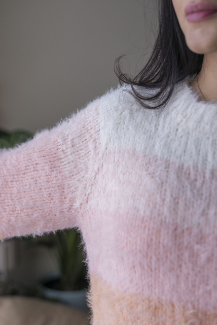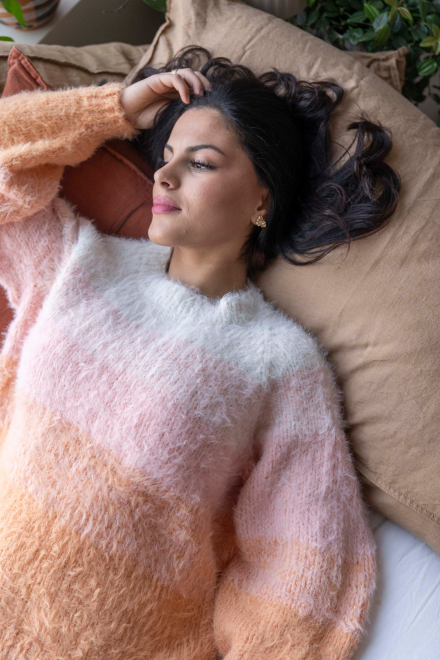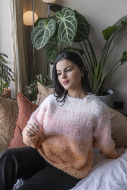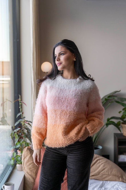 So finden Sie die passende Größe: Messen Sie ein Kleidungsstück aus, das Ihnen gut passt, und vergleichen Sie die Maße mit der Anleitung. Entscheiden Sie sich basierend auf der Brustweite des Rumpfteils für eine Größe. Die Länge des Rumpfteils sowie der Ärmel kann nach Belieben angepasst werden, aber denken Sie daran, zusätzliches Garn zu bestellen, wenn Sie die Länge verändern möchten!