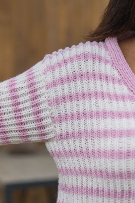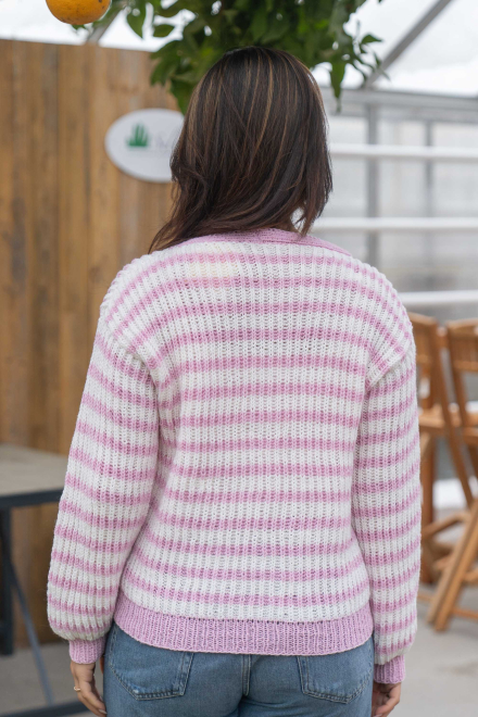 So finden Sie die passende Größe: Messen Sie ein Kleidungsstück aus, das Ihnen gut passt, und vergleichen Sie die Maße mit der Anleitung. Entscheiden Sie sich basierend auf der Brustweite des Rumpfteils für eine Größe. Die Länge des Rumpfteils sowie der Ärmel kann nach Belieben angepasst werden, aber denken Sie daran, zusätzliches Garn zu bestellen, wenn Sie die Länge verändern möchten!