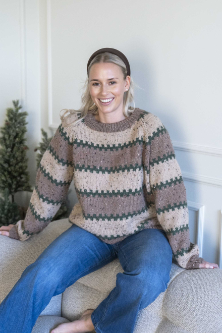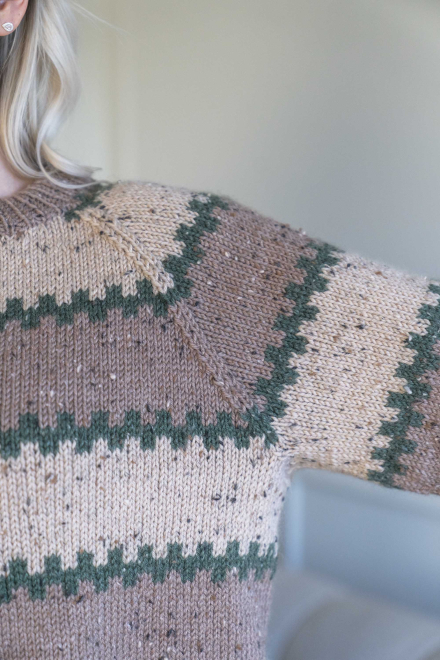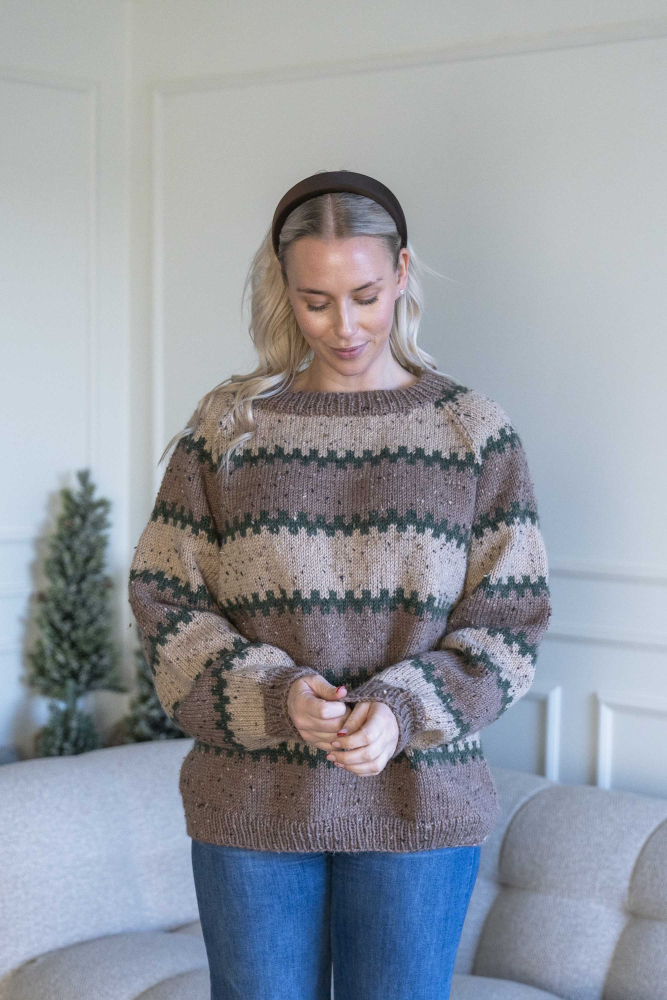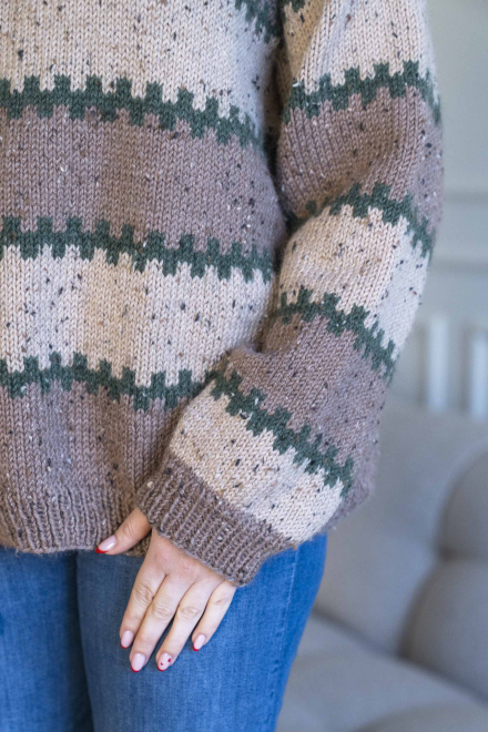 So finden Sie die passende Größe: Messen Sie ein Kleidungsstück aus, das Ihnen gut passt, und vergleichen Sie die Maße mit der Anleitung. Entscheiden Sie sich basierend auf der Brustweite des Rumpfteils für eine Größe. Die Länge des Rumpfteils sowie der Ärmel kann nach Belieben angepasst werden, aber denken Sie daran, zusätzliches Garn zu bestellen, wenn Sie die Länge verändern möchten!