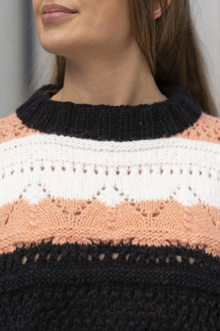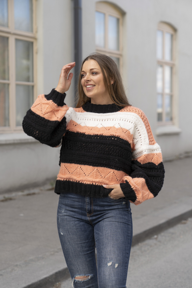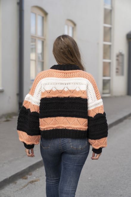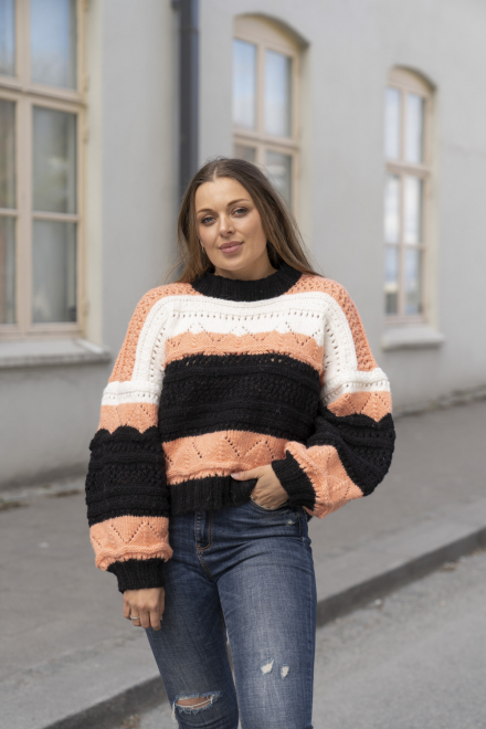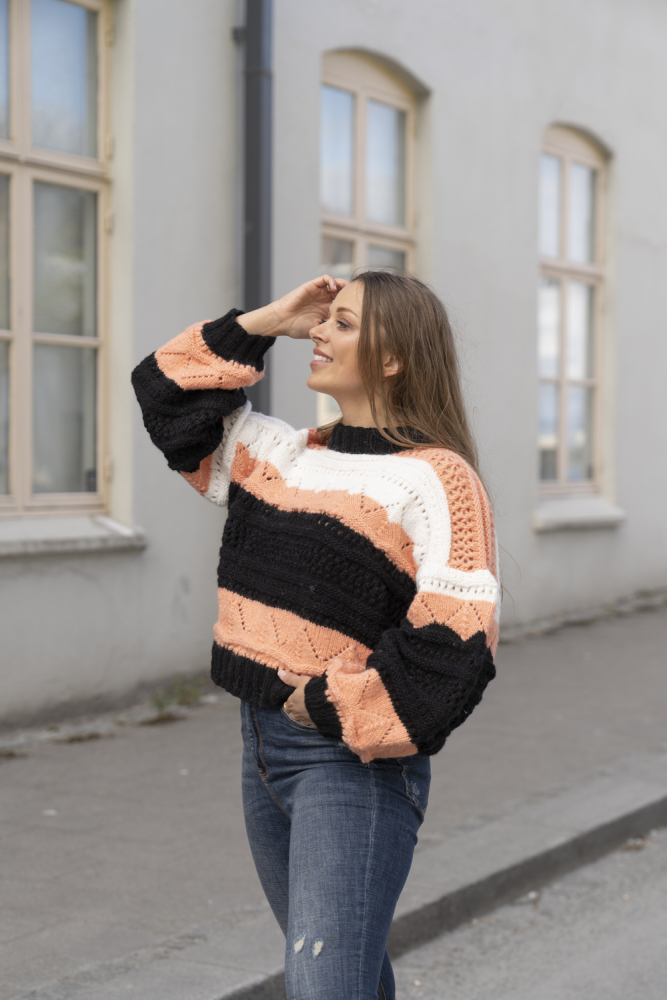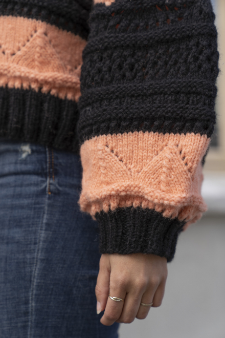 Glatstrik, ret, vrang, hulmønster/struktur. Overkroppen strikkes rundt nedefra og op, og deles ved ærmegab for derefter at strikkes færdigt frem og tilbage. Ærmerne strikkes separat og monteres på. Sværhedsgrad; Middel