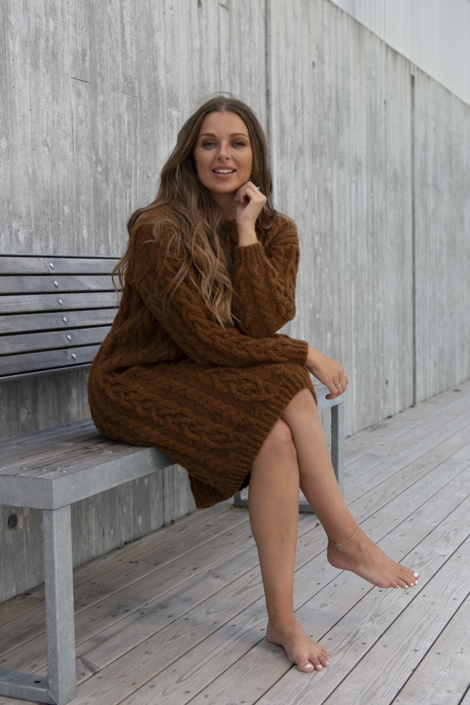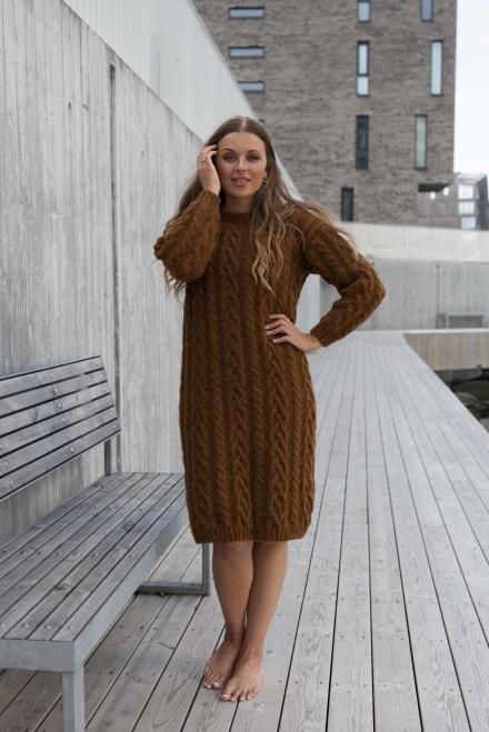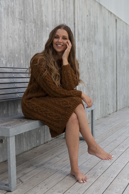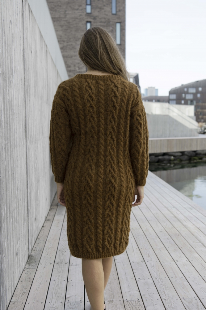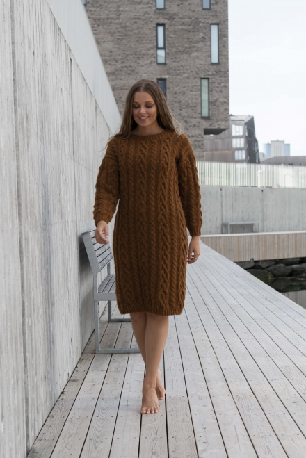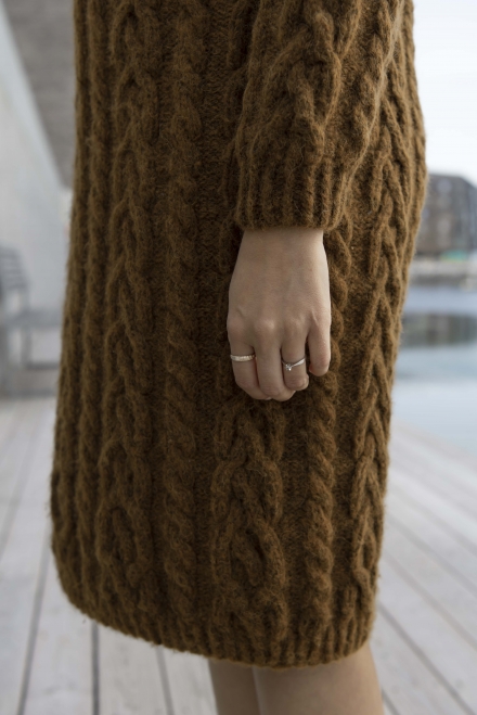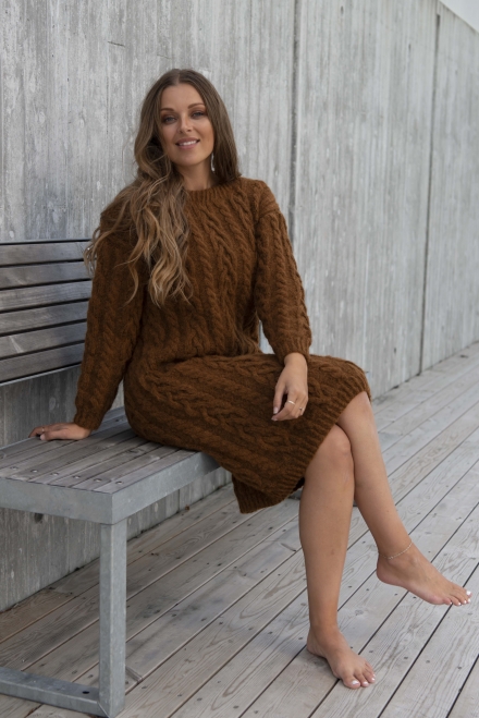 Jethro er en dejlig, læglang kjole med fletmønster over hele kjolen. En smuk, blød og varm kjole som er perfekt når efterårskulden kommer snigende!