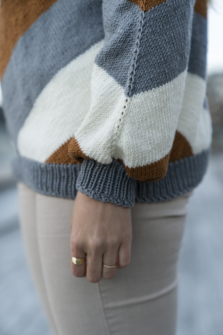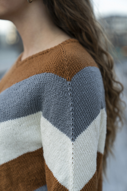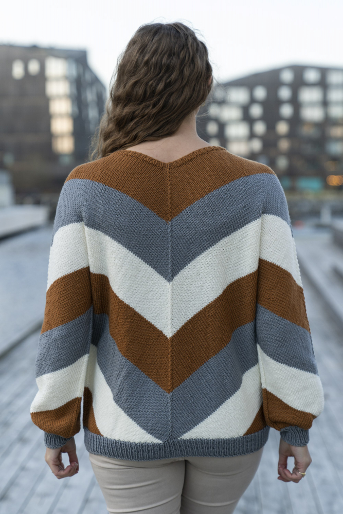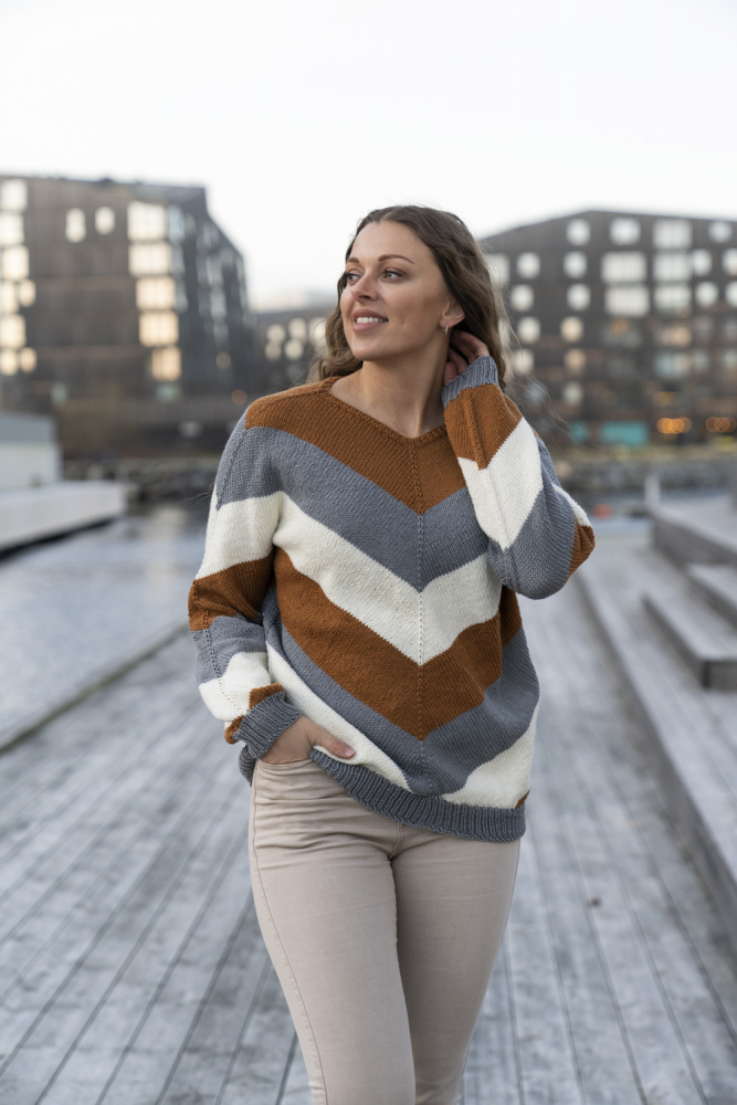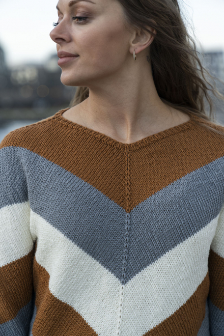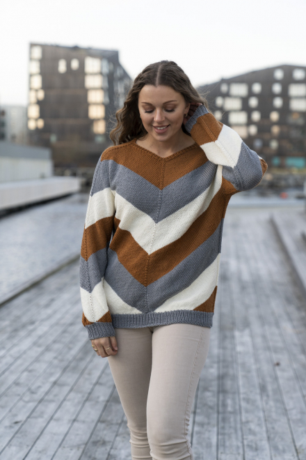 Glatstrik, ret, vrang, mønsterstrik med flere farver. Strikkes rundt, oppefra og ned, og har skrå udtagning på bærestykket. Sværhedsgrad; Middel