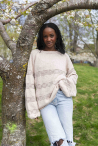 So finden Sie die passende Größe: Messen Sie ein Kleidungsstück aus, das Ihnen gut passt, und vergleichen Sie die Maße mit der Anleitung. Entscheiden Sie sich basierend auf der Brustweite des Rumpfteils für eine Größe. Die Länge des Rumpfteils sowie der Ärmel kann nach Belieben angepasst werden, aber denken Sie daran, zusätzliches Garn zu bestellen, wenn Sie die Länge verändern möchten!