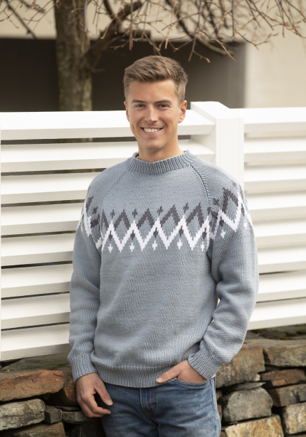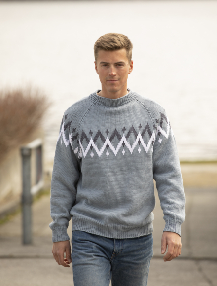 Glatstrik, ret, vrang, mønster med flere farver. Sweatern strikkes rundt, nedefra og op, og er med raglan. Sværhedsgrad: Middel